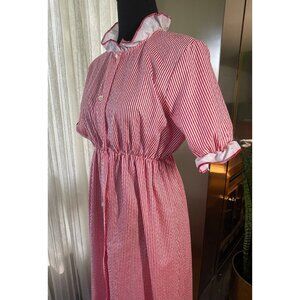 Adorable ankle length shirtdress from the 70s, red and white stripes with 3/4 length sleeves and elastic waist. The sleeves and the collar are both ruffled with contrasting white material. The front is buttoned from the neck to the bottom.