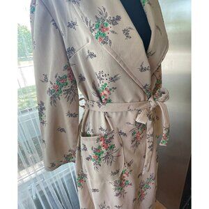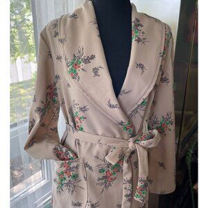 Fabulous 70s housecoat / robe. Gorgeous light taupe wrap around robe, has large floral orange and green print one pocket on the side. material is somewhat stiff with some stretch, likely a double knit. includes an assorted tie belt. Label is frayed so unknown maker and material.