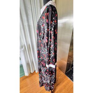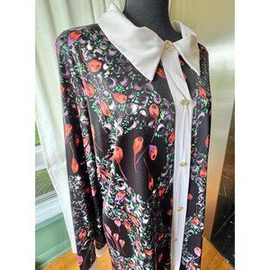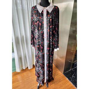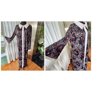 Fabulous 60s housecoat / dress. Ankle length dress/robe, this gorgeous light weight garment has very mod, large abstract floral print in black, purple, orange, pink, teal, a white collar and placket, buttons all the way down. Sleeves have a nice flare, cuffs are also white.