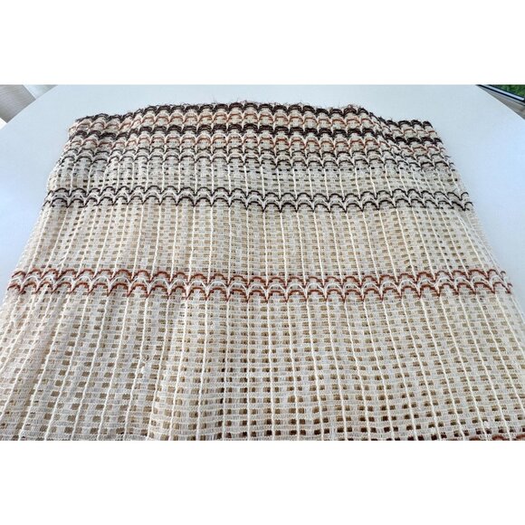Stunning oversized open weave mesh in beige and brown, with horizontal wavy stripes, in rust and darker brown with an ombre effect at the bottom. Perfect drape for a boho living room or bedroom.