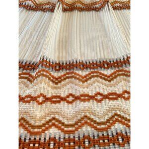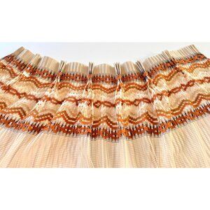 Stunning open weave mesh, in tan, rust, orange and brown, with horizontal wavy stripes. Perfect drape for a boho living room or bedroom.