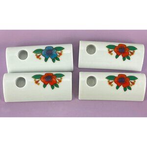 lovely set of vintage West German candle holders. Set of 4, porcelain with colorful flowers on top, three have red ones, one is blue. Cute wave shape. Brand is Funny Design.