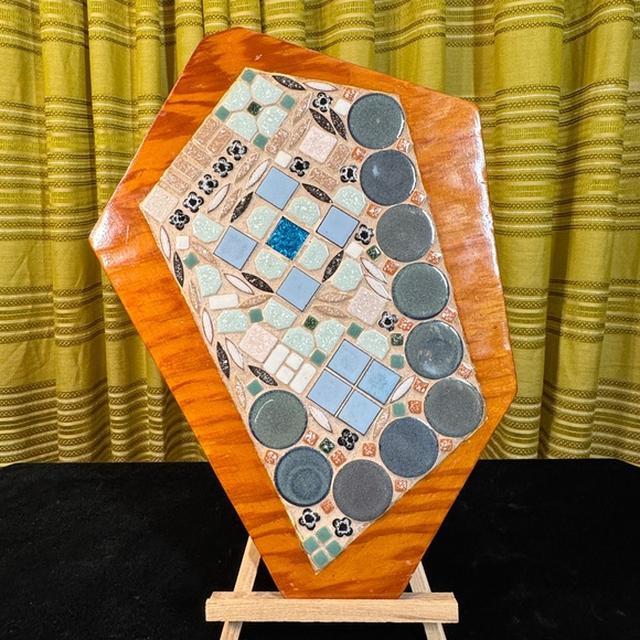 Absolutely unique wall art, made of mosaic tiles, on an asymmetrical wood frame.