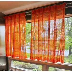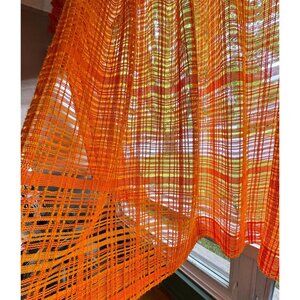 Vintage 70s net curtains, pumpkin orange, yellow open weave mesh, pleated