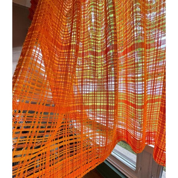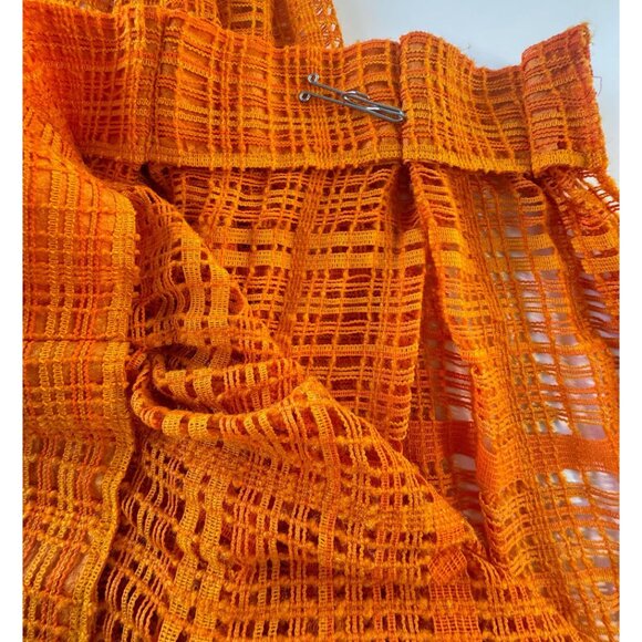 Vintage 70s net curtains, pumpkin orange, yellow open weave mesh, pleated pair