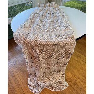 Vintage 70s net woven curtain, beige, tan, cream wavy pattern, pleated panel