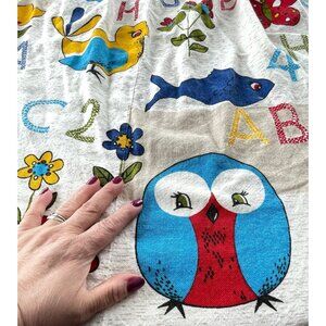 Fabulous 70s curtains, perfect for a nursery or a toddler's room. Large colorful iconic and bold print: owl, birds, butterflies, flowers and numbers