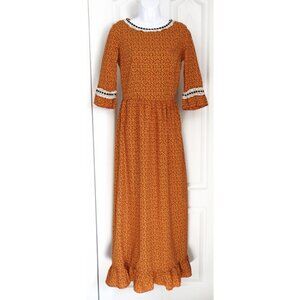 Tags: vintage, prairie dress, prairiecore, cottagecore, maxi dress, floral, summer, 1970s, 70s, orange, yellow, flounce, velvet, lace, boho, romantic