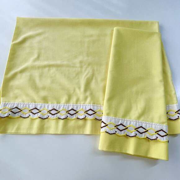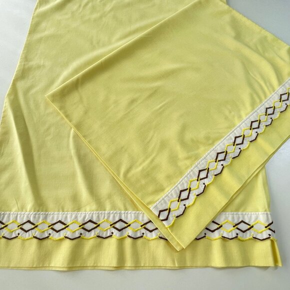 Stunning set of 70s pillowcases, price is for the pair. Solid yellow color with a white, brown and yellow embroidered trim.
