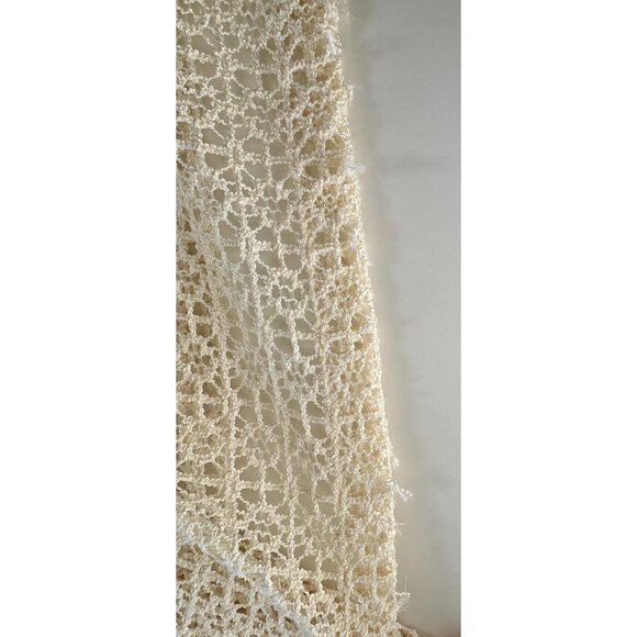 Very boho chic, cream machine lace mesh, the top is an open weave, the bottom is an abstract floral pattern and scalloped edge. Perfect for a living room dining room or bedroom window.