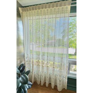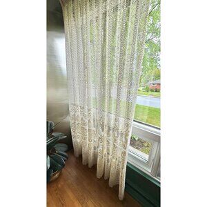 Very boho chic, cream machine lace mesh, the top is an open weave, the bottom is an abstract floral pattern and scalloped edge. Perfect for a living room dining room or bedroom window.