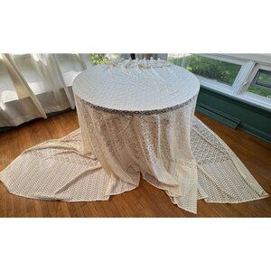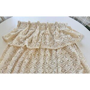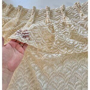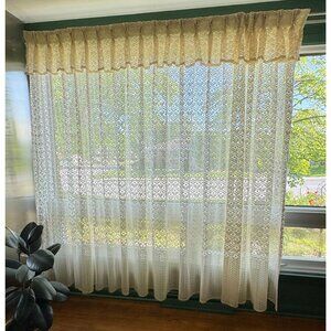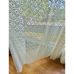 Very boho chic, cream machine lace mesh, it has kind of an abstract floral pattern and chevron bottom. Top has a long 8" ruffle. Perfect for a living room dining room or bedroom window.