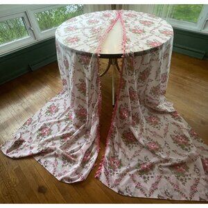 Vintage 70s pleated curtain with pompons, pink roses floral double panels