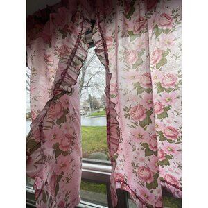 Vintage 70s pleated curtains, cabbage roses pink floral, ruffle double panels