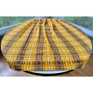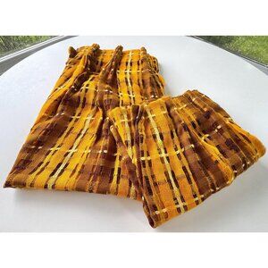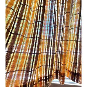 Vintage 70s pleated curtains, orange, yellow, brown plaid, pair of mesh panels