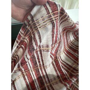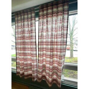 Red, tan and cream plaid pattern, the panels are pleated, can be hung using 3" pleating hooks as shown in pictures, not included. can also use single hooks or clips.