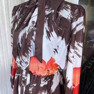 Gorgeous 70s shirtdress, long sleeves with a beautiful floral pattern. There are ties at the neck to form a bow or knot. Waist is elastic. Made by Edward, in Canada