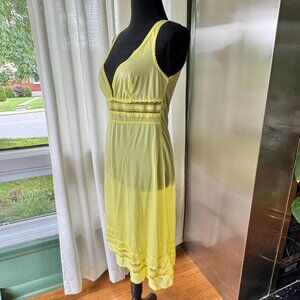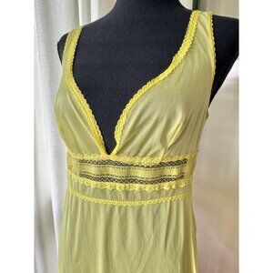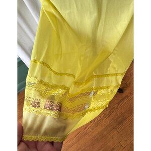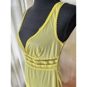Vintage 70s negligee, in sunny yellow, sleeveless with a gorgeous deep V neckline. it has lace inserts at the empire waist and the bottom hem, very feminine. Knee length, this slip-on nightgown is slimming and the perfect retro sleepwear. Fabric is likely synthetic blend, very soft with a nice flow.