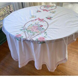 Vintage 70s tablecloth, embroidered fruits, weave baskets, rectangle table linen