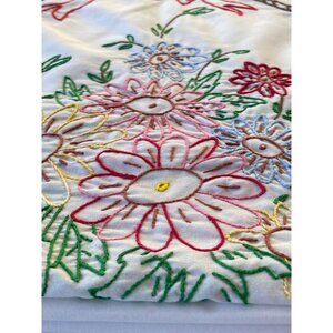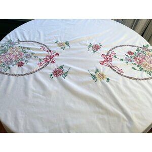 Lovely vintage embroidered tablecloth. Rectangle white tablecloth with hand stitched fruits appliqués and embroidery.