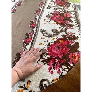 Vintage classic floral tablecloth, from the 70s. Colorful pink floral pattern over a cream and tan background. Unknown material, feels like a soft cotton/synthetic blend.