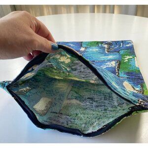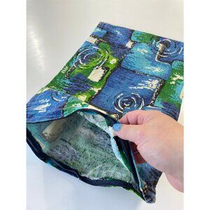 likely handmade in the 60s/70s, made with thick upholstery material, in MOD abstract blue green and white pattern.