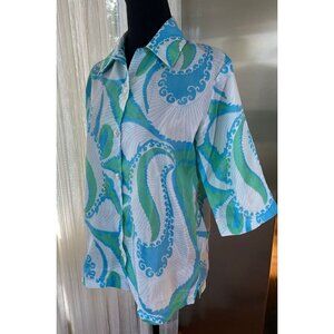 Cute 70s paisley green and blue on white buttoned up shirt; perfect for summer or spring. Straight collar, 3/4 long sleeves and buttons on the front.