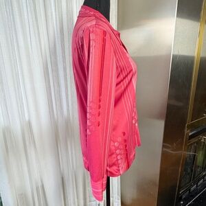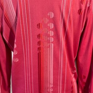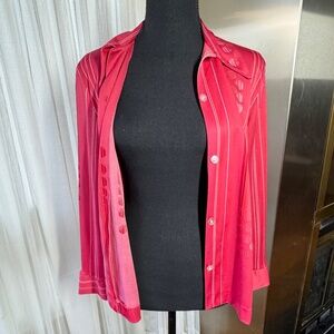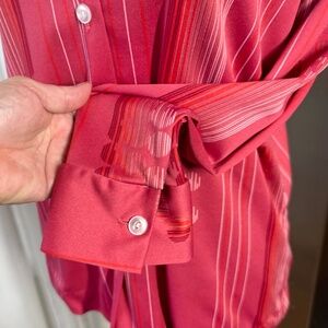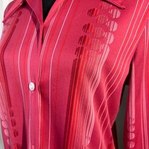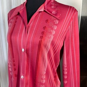 Vintage 1970s blouse top. Gorgeous raspberry red color with a striped abstract pattern in pink, red and burgundy. It has dagger lapels and long sleeves.