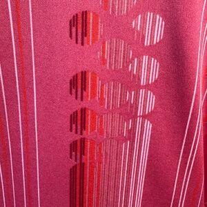 Vintage 70s top, raspberry red, white abstract stripes, long sleeves, 8/10 (M)