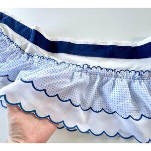 Different shades of blue in a tiny checkered pattern, with a white /navy top trim and a white ruffled scalloped bottom.