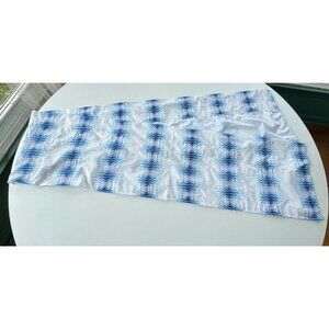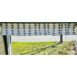 Vintage 70s valance curtain, white, navy, blue geometric abstract pattern