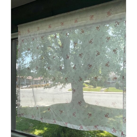 Lovely vintage sheer curtain panel, only one panel is available. Delicate pink flowers bouquet, very romantic floral pattern over a white background.