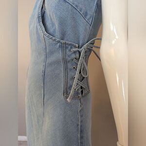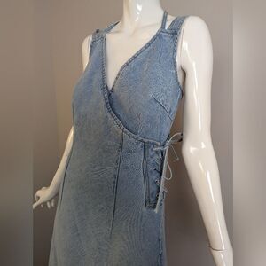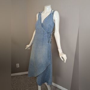 Channel your inner 2000s It Girl with this vintage 725 Originals denim dress. Features a halter-style strap detail, wrap-style asymmetrical skirt, and side lace-up corset accent.