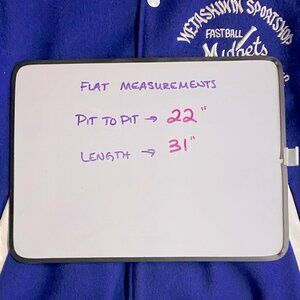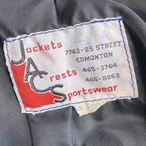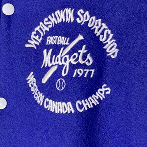 Vintage ‘77 Blue Varsity Jacket W White Leather Sleeves Wetaskiwin Sportshop S