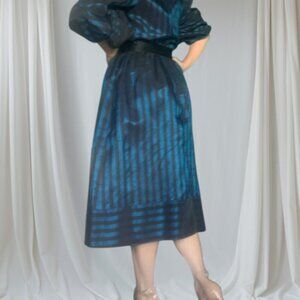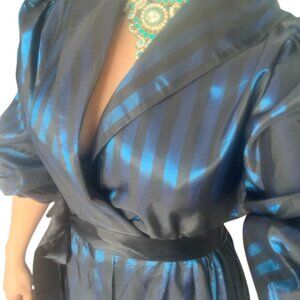 Tags: midi wrap dress, elegant dress, sophisticated fashion, balloon sleeves, shimmering fabric, iridescent finish, blue and black stripes, flattering fit, comfortable dress, dress with pockets, high-quality fabric, timeless style, stylish dress, classic fashion, versatile dress, detailed design, durable fabric, statement dress, unique dress, fashion investment, formal wear, chic style.