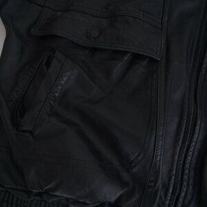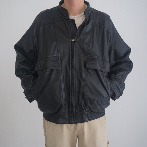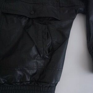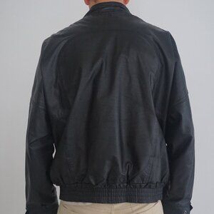 Vintage '80s Sears The Men's Store Black Zip-Up 100% Leather Bomber Jacket. This classic piece features a smooth black leather exterior with a timeless bomber silhouette, ribbed cuffs, and a zippered front closure. Designed for both style and durability, it exudes vintage appeal with its slightly worn-in look, making it a staple for any retro wardrobe.