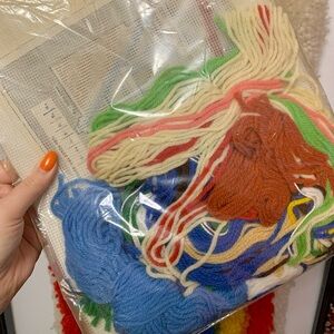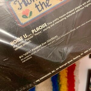 Like new in the package 1983 Dimensions kitschy “Home is where the ❤️ is” crewel/needlepoint plaque. Has all the instructions and original materials inside. Only the bottom row was started as pictured. Pattern is not preprinted on the backing.