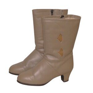 Vintage 80's/90's Beige calf length, kitten heel woman dressy boots In excellent pre-owned condition. Features fully lined interior with pure wool lining for extra warmth, 2" kitten heels, Leather upper with rubber soles, expandable elastic and zipper side, 7' wide calf, (flat), 12" full length. Smoke and pet free home.
