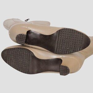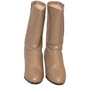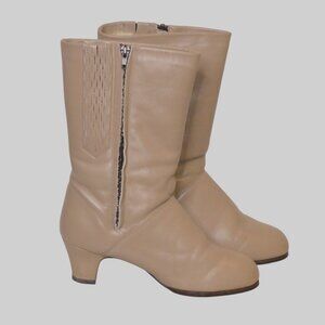 Vintage 80's/90's Beige calf length, kitten heel woman dressy boots In excellent pre-owned condition. Features fully lined interior with pure wool lining for extra warmth, 2" kitten heels, Leather upper with rubber soles, expandable elastic and zipper side, 7' wide calf, (flat), 12" full length. Smoke and pet free home. l ship immediately.