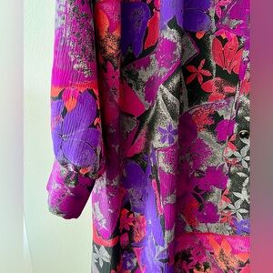 Gorgeous, flowy, vintage 1980s / 90s shirtdress in beautiful colours and pattern. Lightweight and breezy. Falls to approximately mid-calf (based on someone who is 5’6”). No size noted, but approximately a large/XL.