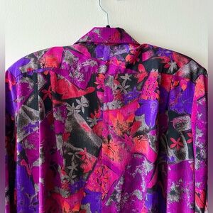 Cinch with a belt, or let it flow freely. Collared with a few buttons at chest. Cuffs on sleeves have a button to fasten, or unbutton to roll up sleeves for styling. Shoulder pads are attached, but could be removed by snipping out. Perfect condition.
