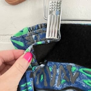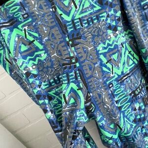 Classic 80s 90s muscle pants. Mid weight woven cotton twill. Interesting indigo gray black neon greenall over print of abstract texture with wave/ aztec/geometrical pattern.