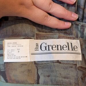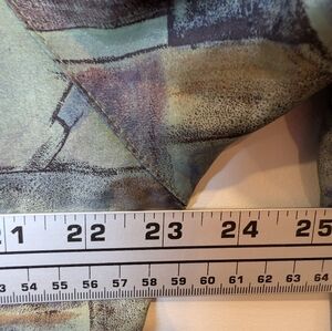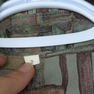 Stylish vintage trench coat featuring an abstract pattern. Double-breasted design with a belt. Perfect for a unique look. Size 9. Shoulder pads which would be easily removed if that’s not your thing.