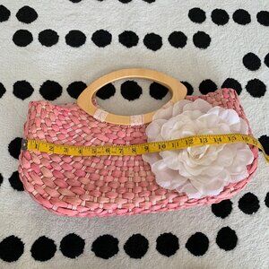 Vintage 80s 90s Wicker Straw Purse Handbag Clutch Pink Flower Wood Top Handle