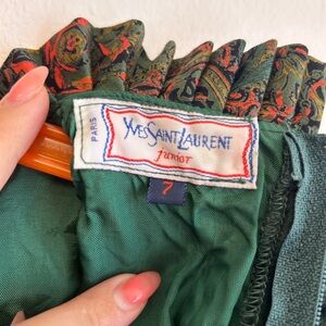 Elegant and rare YSL Junior dress featuring a luxurious deep forest green velvet bodice with structured puff sleeves and double-breasted button detailing. The skirt and ruffled collar showcase a richly patterned floral tapestry print in shades of red, green, and gold, giving the piece a romantic, old-world charm. The dress is fully lined with a tulle underlayer for added volume.