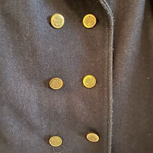 Gorgeous vintage wool coat from Antels. Navy blue wool coat with gold detailed buttons, double breasted. Oversized shoulders and structured style. Size 16 1/2. Fits an XL. Excellent condition, minus a little fuzz.