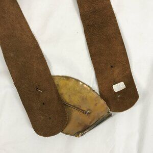 Vintage 80s belt. Heavy metal artisan buckle with two back hooks to attach/size. Soft tan suede leather belt with holes at both ends to adjust size. No maker but an xs sticker on back BUT please see measurements below to determine if it will work for you.