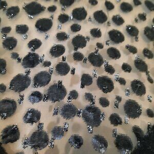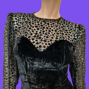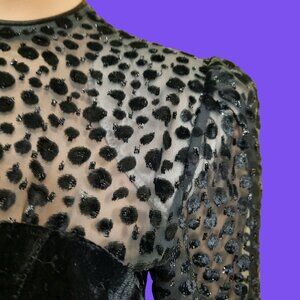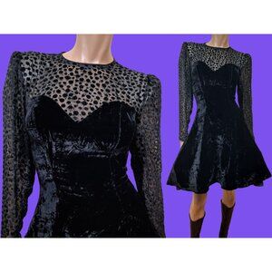 * Vintage 80's black crushed velvet fit flare dress with sheer velvet flocked sleeves and a touch of giltter
