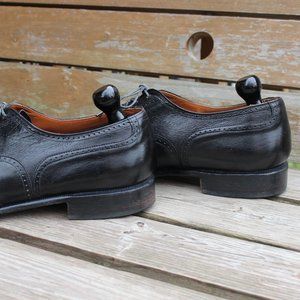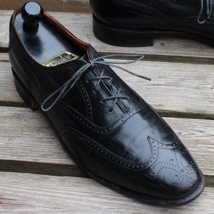 GUC. Recently professionally detailed, the uppers are in great condition, with no cracks or major scratches, although one surface scuff on the left wing tip has been re-polished (see pics). Heels and original leather soles have minor wear, but these can be completely resoled by a cobbler. They are conditioned and have had some color polish added to minor scuffs on the heels.