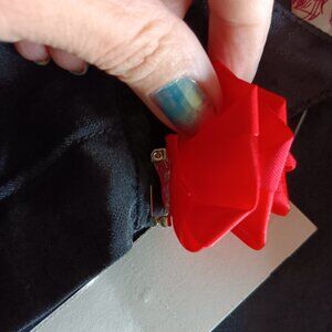 This blouse is fabulous. Not only does it have it's original Robinson's tag, when I purchased it the original receipt was pinned to the interior with an original purchase date of November 26, 1988! This blouse features a removable rose at the neck, hidden buttons, and a button at each wrist. Made in Canada, 100% polyester, a vintage size petite/small. Nina label. Measurements taken lying flat: Armpit to armpit: 19", Shoulder to shoulder: 16", Full length: 27.5".